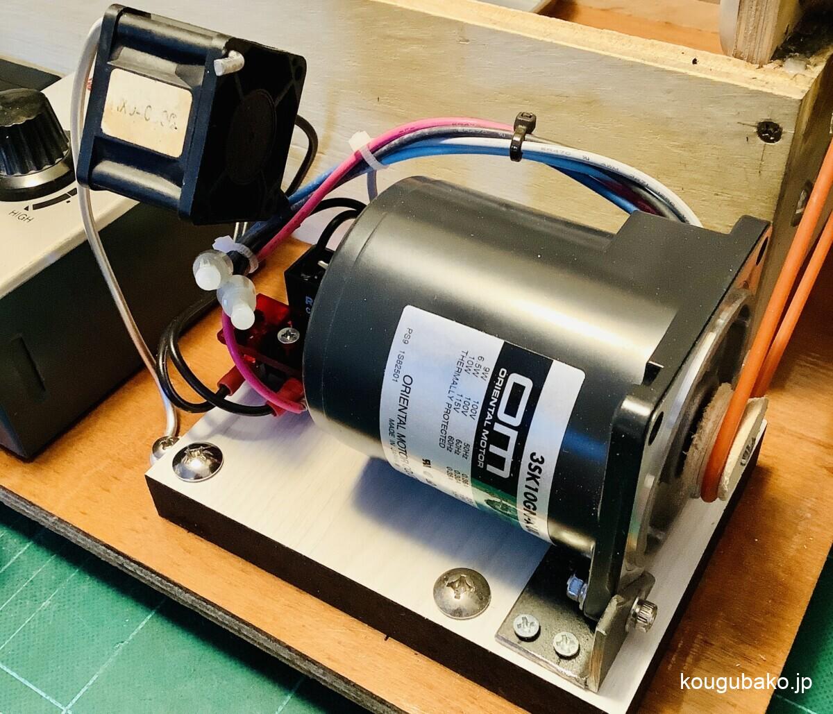 設計も無く、てもとにある材料で作り出した回転バレル研磨機。モーターを信頼できるものに交換したのは良いのですが配線部分に100V端子がむき出しです。今回は簡単なカバーを取り付けることにしました。簡単な端子カバーを取り付けるネジを落とすとか、水............